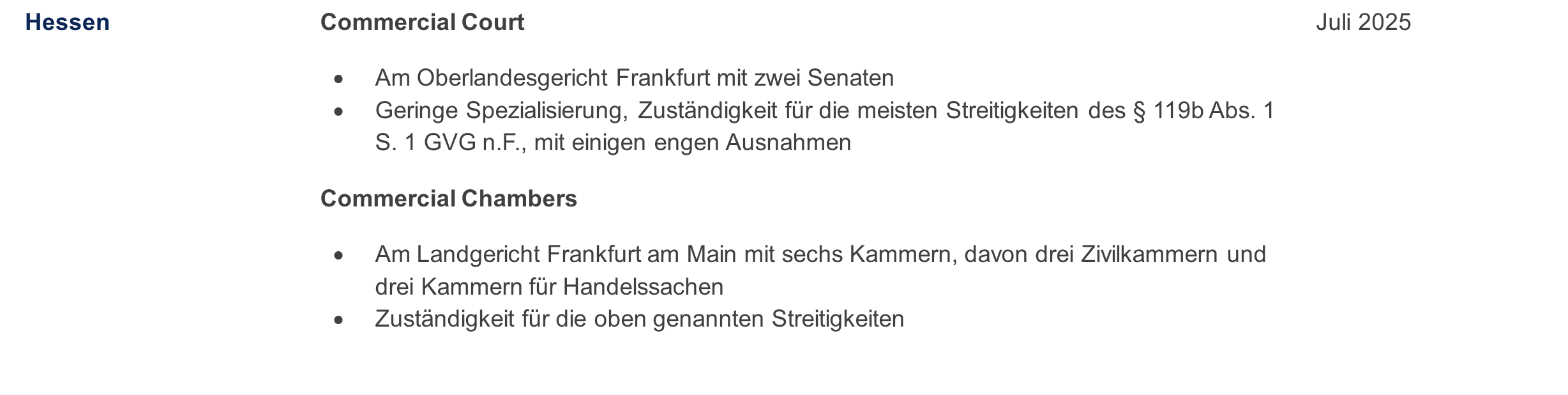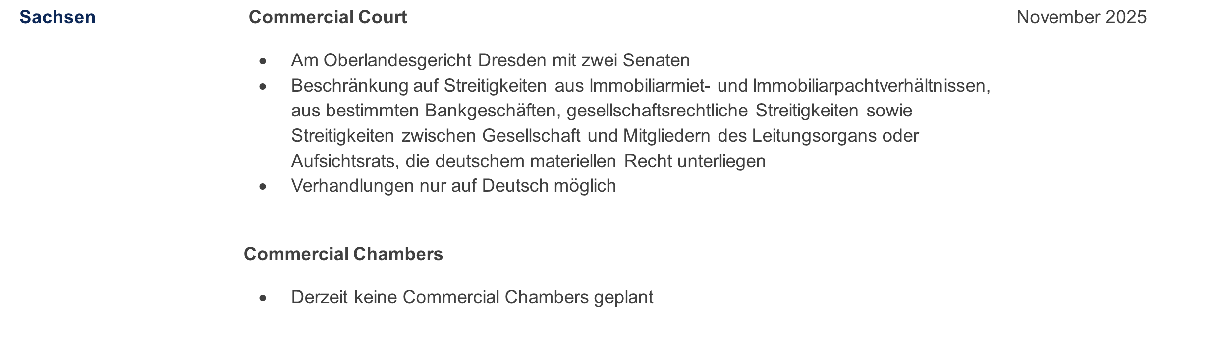 Tatsächlich wurde inzwischen in insgesamt neun Bundesländern (Baden-Württemberg, Bayern, Berlin, Bremen, Hamburg, Hessen, Niedersachsen, Nordrhein-Westfalen und Sachsen) ein Commercial Court eingerichtet. In Sachsen besteht die Besonderheit, dass vor dem dortigen Commercial Court Dresden nur auf Deutsch verhandelt werden kann.