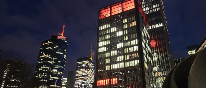 Im Rahmen des Aktionstags ‚Orange the World' leuchteten die Konferenzetage im 16. Stock der Taunusanlage 11 in Frankfurt und das Stuttgarter Bürogebäude in orange und setzten damit ein sichtbares Zeichen gegen Gewalt an Frauen und Mädchen.
