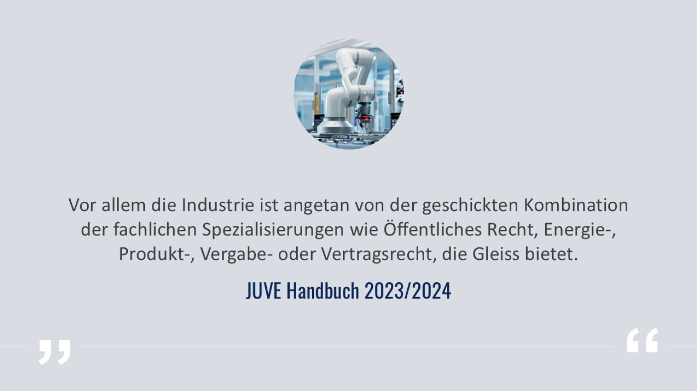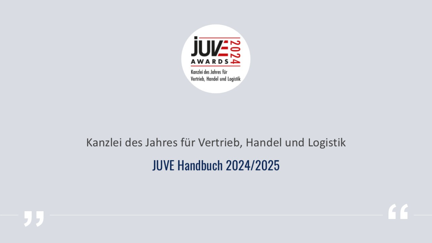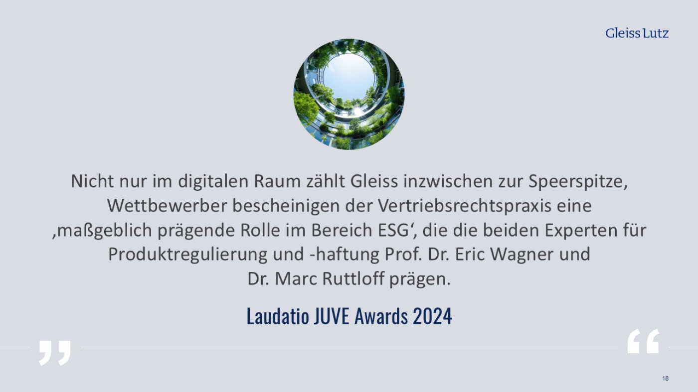 Die JUVE-Redaktion zeichnete Gleiss Lutz 2024 als „Kanzlei des Jahres für Vertrieb, Handel und Logistik“ aus und ehrte sie für die führende Rolle im Bereich Commercial, insbesondere bei Zukunftsthemen wie ESG und Digitalisierung.