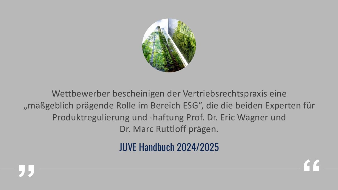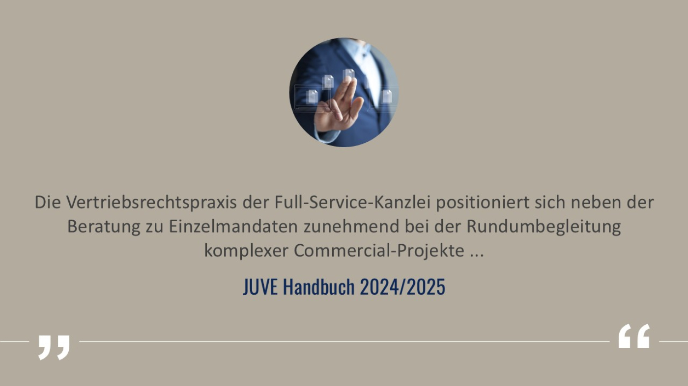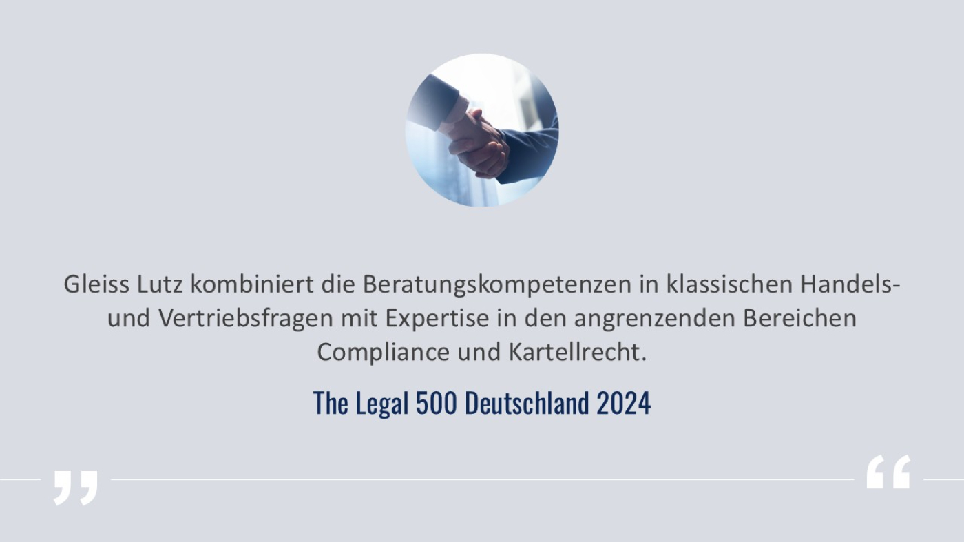 Die JUVE-Redaktion zeichnete Gleiss Lutz 2024 als „Kanzlei des Jahres für Vertrieb, Handel und Logistik“ aus und ehrte sie für die führende Rolle im Bereich Commercial, insbesondere bei Zukunftsthemen wie ESG und Digitalisierung.