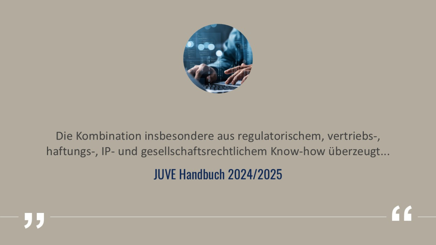 Zudem unterstützen wir bei der Gestaltung von mit Hilfe von KI automatisierten Vertragsschlüssen („Smart Contracts“) und beraten zu den Haftungsfragen im Zusammenhang mit KI, einschließlich der Frage, wer bei der Verletzung von Immaterialgütern durch KI haftet.