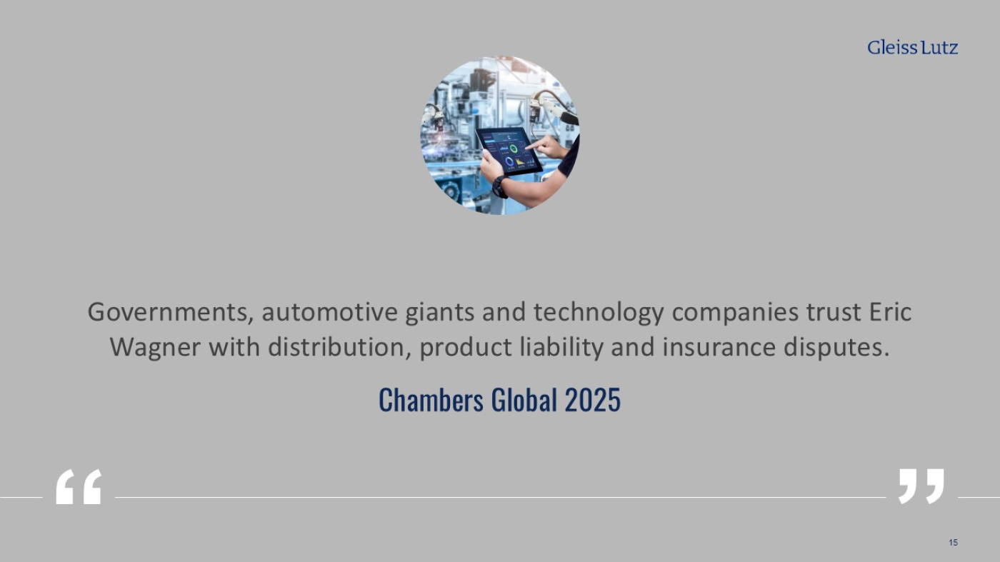 Gleiss Lutz berät im Bereich Commercial umfassend zu nationalen und internationalen Projekten mit erheblicher wirtschaftlicher Bedeutung zu verschiedenen Rechtsbereichen. Hierzu gehört insbesondere die Strukturierung- und der Aufbau von Einkaufs- und Vertriebsstrukturen, die Vertretung bei der Aushandlung wichtiger Verträge, die Durchsetzung und Abwehr von Ansprüchen in vertrags-, haftungs- und handelsrechtlichen Streitigkeiten vor nationalen Gerichten und Schiedsgerichten, der Aufbau von Contract Management Systemen, die präventive Entwicklung von Risikovermeidungsstrategien und die Begleitung in Krisensituationen wie Produktrückrufen. Auch in Bereichen wie E-Commerce und Industrie 4.0 haben wir bereits einen umfassenden Track Record.
