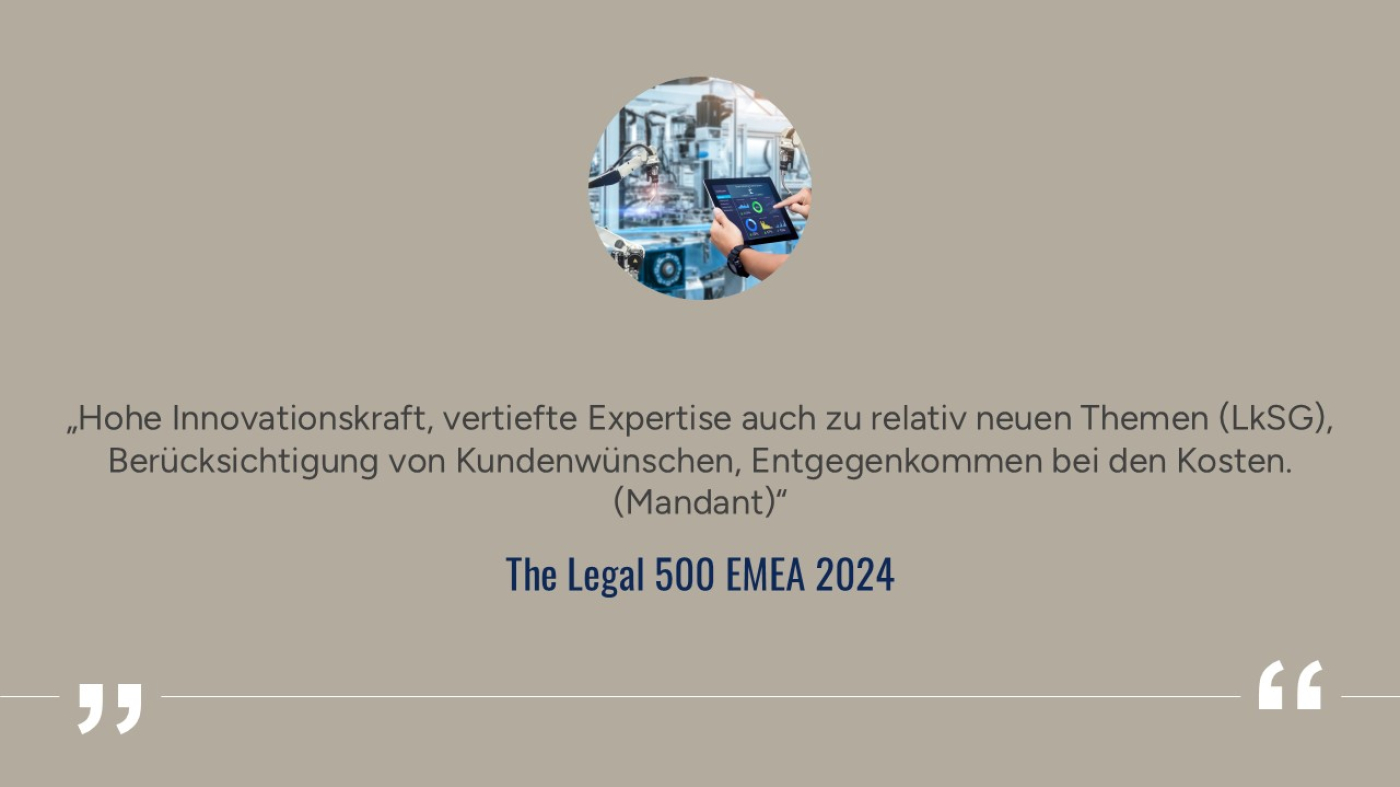 - In allen namhaften Rankings als führende Experten für u.a. Commercial und Produkthaftung geführt (JUVE, Chambers, Legal500, Who`s Who/Lexology, Wirtschaftswoche, The Best Lawyers/Handelsblatt, u.a.)