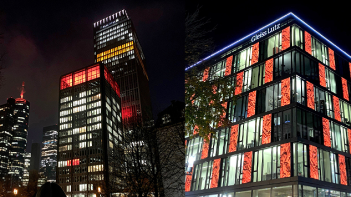 Unsere Büros in Stuttgart und Frankfurt setzten ein weithin sichtbares, orange leuchtendes Zeichen gegen Gewalt an Frauen. Anlass war der von UN WOMEN, der Einheit der Vereinten Nationen für Gleichstellung und Ermächtigung der Frauen, ausgerufene „Internationale Tag zur Beendigung der Gewalt gegen Frauen“. Ziele sind, Aufklärung und Aufmerksamkeit für ein Thema zu fördern, das häufig unsichtbar bleibt und tabuisiert wird.