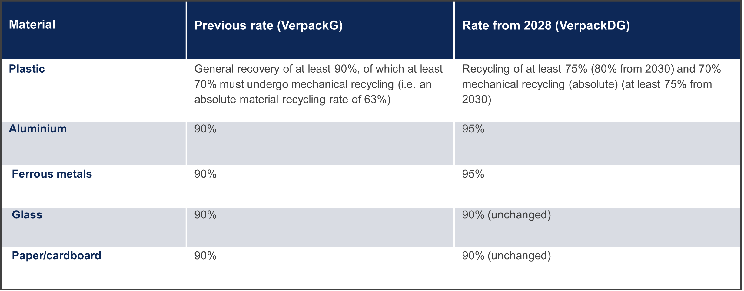 The VerpackDG raises the recycling rates for certain packaging materials. The systems must meet the following minimum rates (in percent by mass) from 2028: