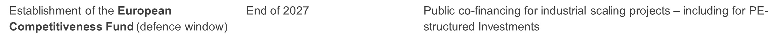 Starting in 2027, the future European Competitiveness Fund – through its window for resilience and security, defence and space – will become the first dedicated EU financing instrument to open industrial scale-up projects to PE-structured capital. In combination with SAFE, EDIP and EDF, this will create a clear funding path for long-term defence investments.