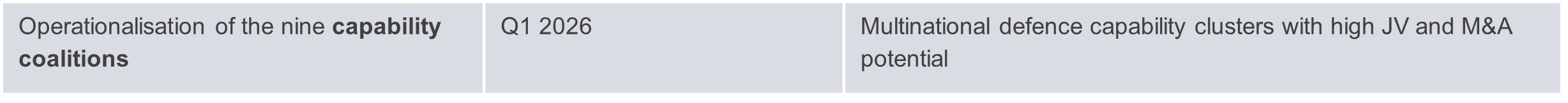- Capability coalitions will facilitate cross-border integration, with investment activities – including joint ventures and minority shareholdings – focusing on priority military capability areas.