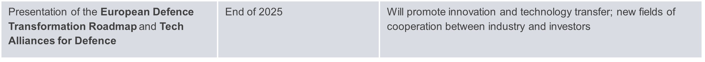 The Commission and the High Representative have also announced a European Defence Transformation Roadmap and Tech Alliances for Defence for the end of 2025 / beginning of 2026. These initiatives will address technology gaps and foster knowledge transfer between industry, research and investors – strengthening cross-sector collaboration and deal-driven alliances.