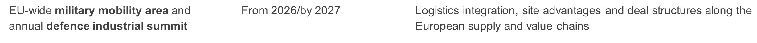 The following milestones illustrate how the industrial and regulatory framework will develop by 2030. In addition to the full implementation of the roadmap, new mechanisms such as the EU-wide military mobility area and the annual defence industrial summit will be decisive for investment decisions and site selection.