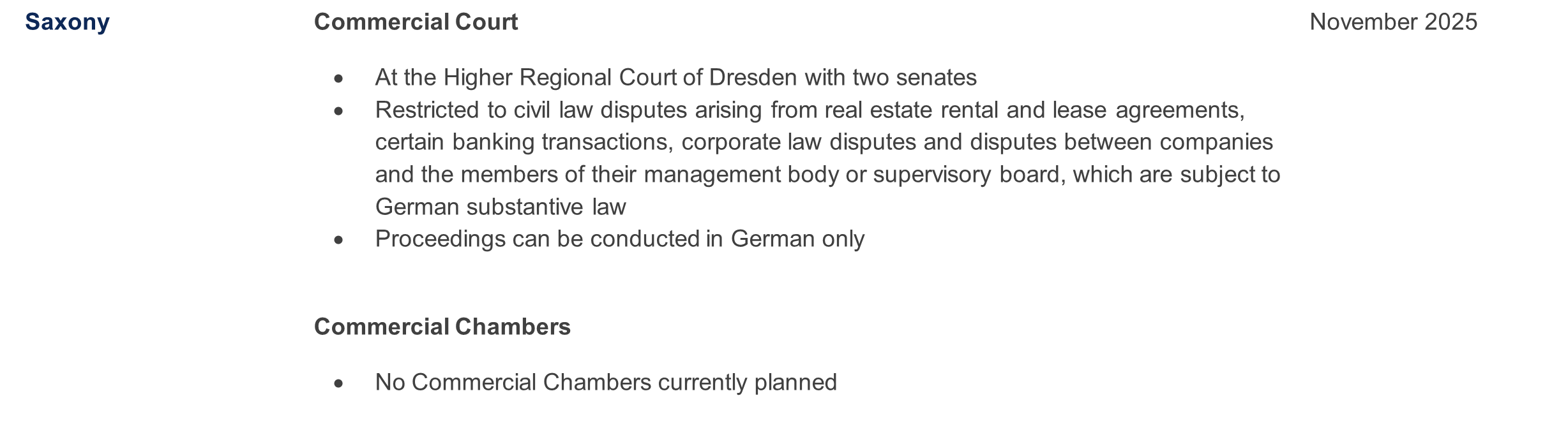 In fact, Commercial Courts have now been established in a total of nine federal states (Baden-Württemberg, Bavaria, Berlin, Bremen, Hamburg, Hesse, Lower Saxony, North Rhine-Westphalia, and Saxony). Saxony has a special feature: proceedings before the Commercial Court in Dresden can be conducted in German only.