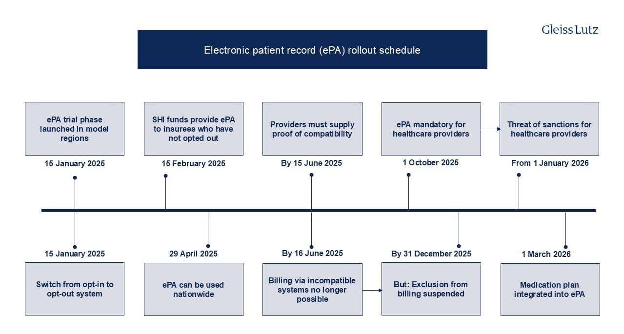 - Since 2024, all private health insurance companies and SHI funds have been able to include a function in their electronic patient record apps enabling e-prescriptions to be received and filled.
