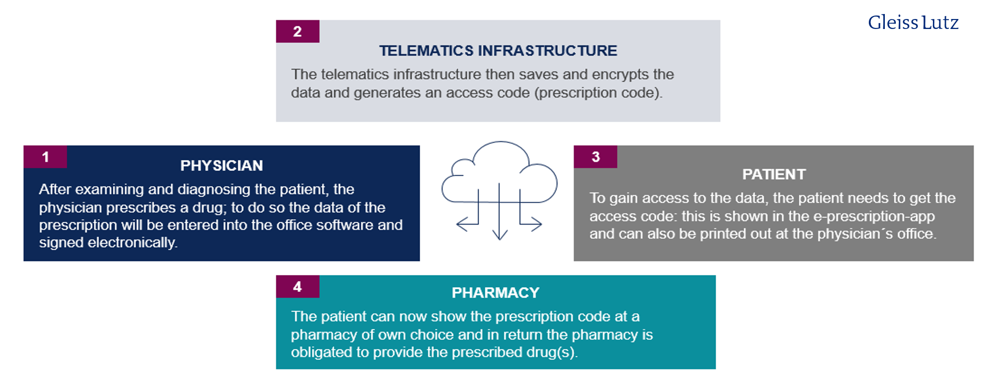 - To use e-prescriptions, physicians must be linked to the telematics infrastructure and be in possession of an electronic health professional card, to enable an electronic signature. Patients need the e-prescription app to use e-prescriptions. Pharmacists must also be linked to the telematics infrastructure. A diagram of the e-prescribing process can be found here.